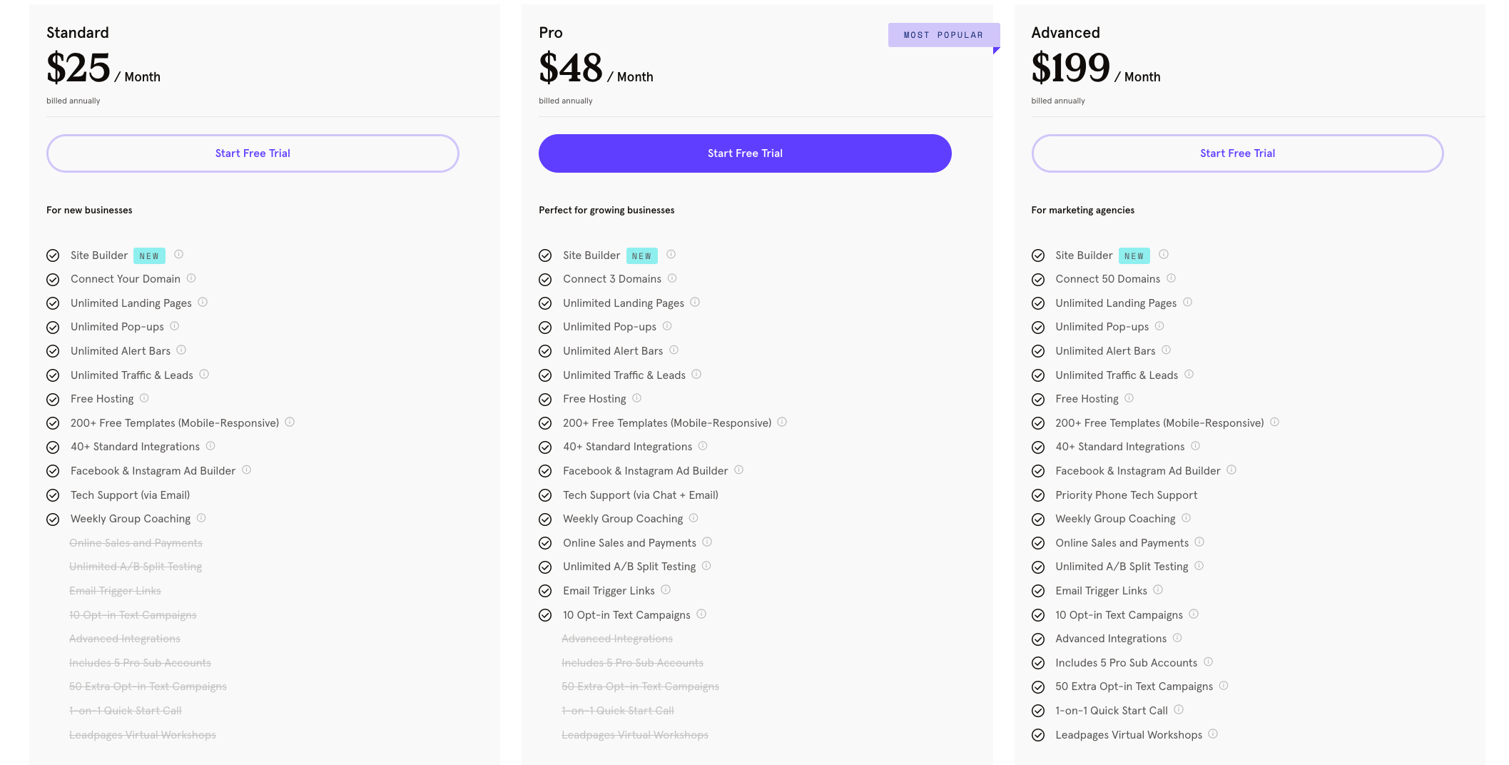 At first glance, LeadPages looks like a steal. After all, their most basic plan clocks in at $25/month when billed annually. However, even LeadPage’s most ADVANCED plan ($199/month) doesn’t include affiliate management, or email marketing, or video hosting, or helpdesk software, or a scheduling system, or a membership site builder.