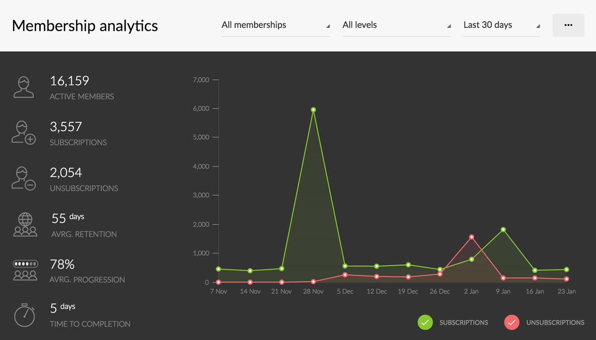 Filter your analytics as broadly or as specifically as you need: by date, by membership, by access level, etc.