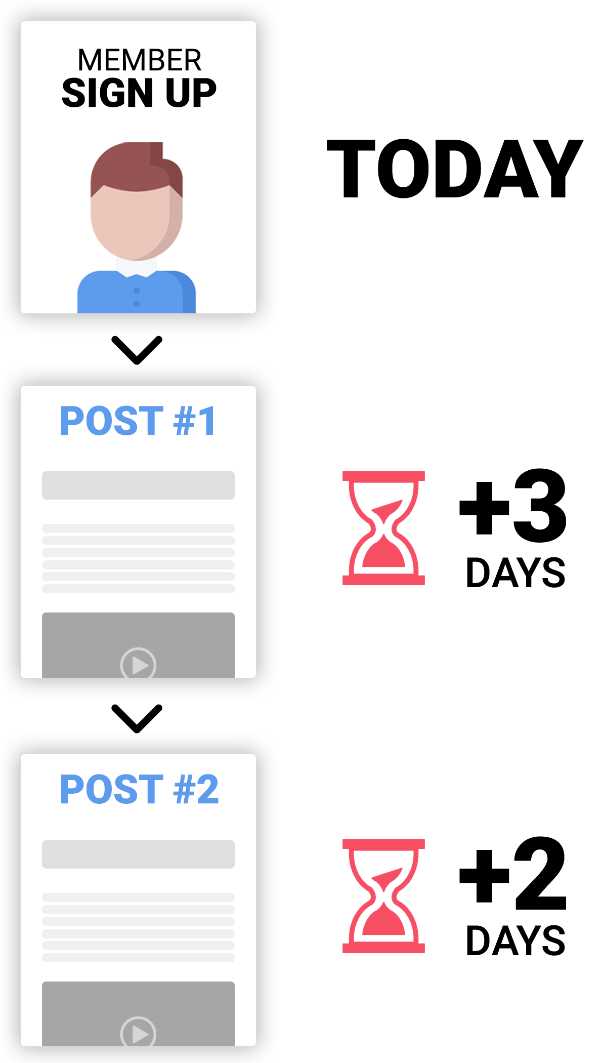 Configure your posts to be automatically released X days from sign up date, so each user receives your content at their own particular pace. That way, no matter whether they sign up today or in a year from now, their progression experience (and content consumption pace) will be the same.