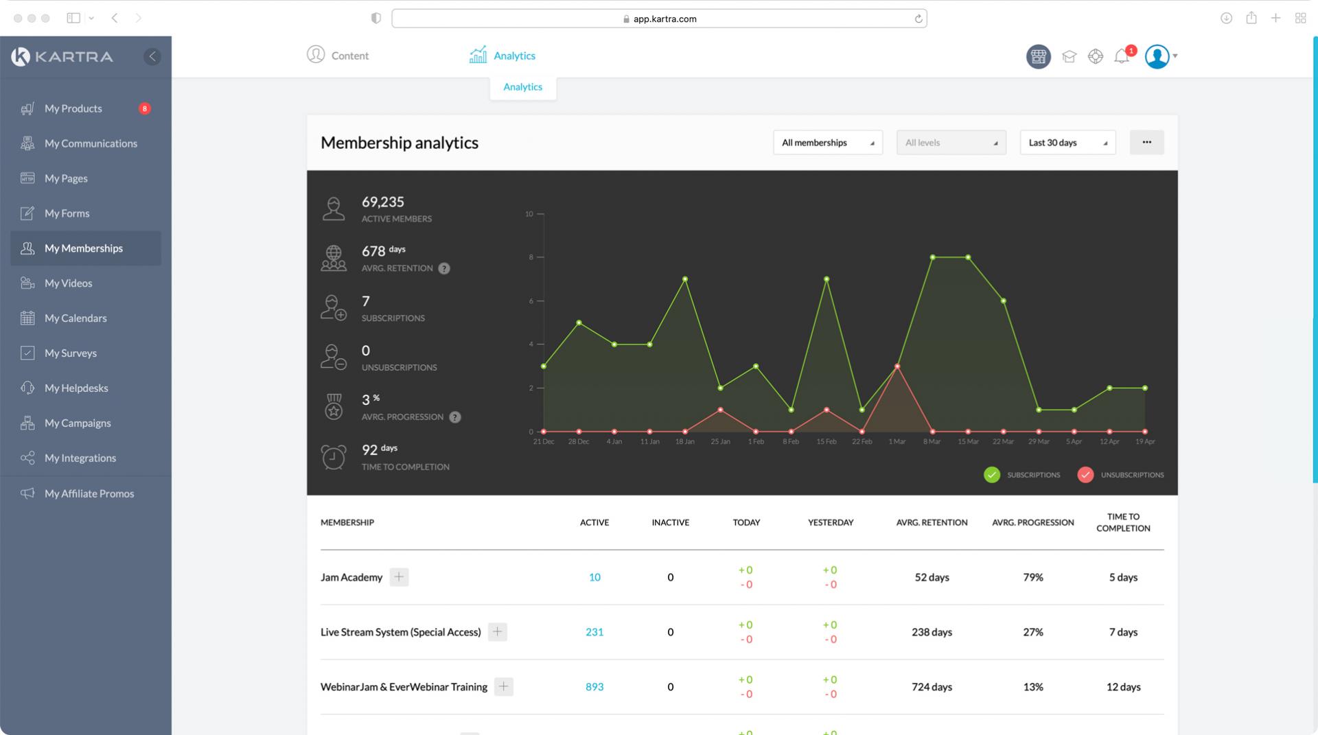 Kajabi also has this, but it can only track buyers’ behavior inside the membership area. You’ll know what users watched, how much time they spent, and so much more.